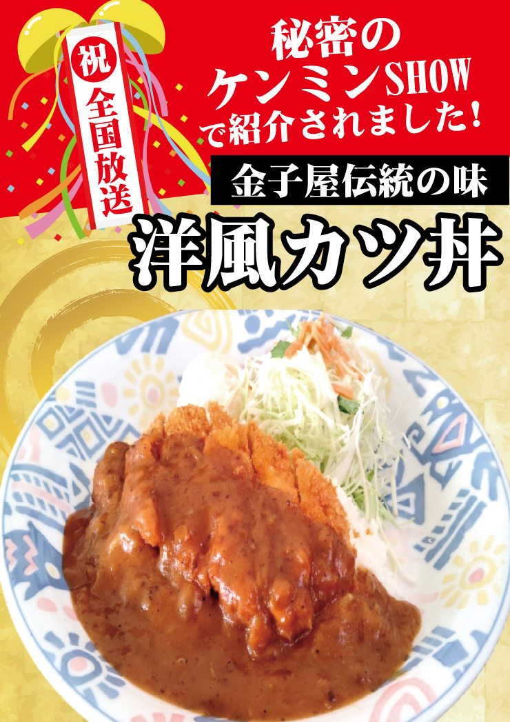 【祝!全国放送】「秘密のケンミンSHOW」にて金子屋大島店の『洋風カツ丼』が紹介されました。【2025年10月23日(木)】 2025.10.24 金子屋グループ 2025年10月23日(木)「秘密のケンミンSHOW」にて 金子屋大島店の『洋風カツ丼』が紹介されました🎉 =========== ☆大島店・下条店 1,100円(税込) ☆海龍店 1,200円(税込) =========== 皆様も是非、金子屋伝統の味をご賞味ください!😋