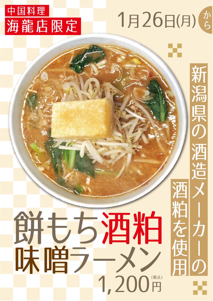 【海龍 限定メニュー】餅もち酒粕味噌ラーメン(新潟県の酒造メーカーの酒粕を使用) 2026.01.26 海龍 中国料理海龍店限定 新潟県の酒造メーカーの酒粕を使用 餅もち酒粕味噌ラーメン 1,200円(税込) 2026年1月26日(月)から